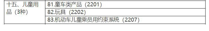 调整后的强制性产品目录里儿童用品分为3种,分别为:童车、玩具、机动车儿童乘员用约束系统,包括童车类产品(2201)、玩具(2202)和机动车儿童乘员用约束系统(2207),将过去单列的各类玩具产品归入“玩具”这一大类中。