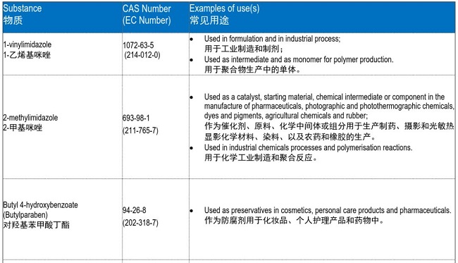 此次评议的五种物质分别是1-乙烯基咪唑、2-甲基咪唑、对羟基苯甲酸丁酯、双(乙酰丙酮酸)二丁基锡、间苯二酚。若5种物质通过公众评议,在2020年6月或者7月时,SVHC物质可能将从205项增加至210项。