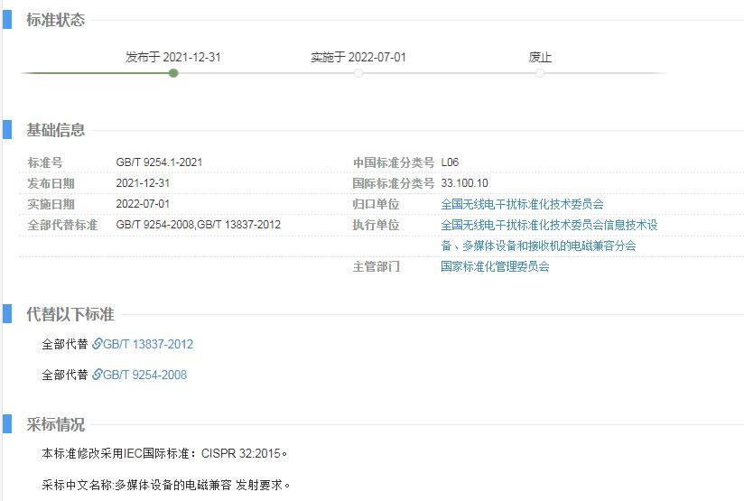 由全国无线电干扰标准化技术委员会于2021年12月31日公布新的国家标准GB/T 9254.1-2021《信息技术设备、多媒体设备和接收机 电磁兼容 第1部分:发射要求》。