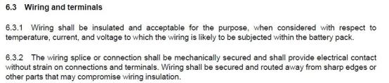 6.3.1 导线应该绝缘且满足当前用途对它的要求,比如,在电池包中使用时,导线所能承受的电压、电流、温度应满足电池包对它的要求,导线在电池包中使用时不会被超范围使用。
